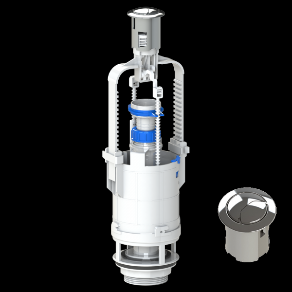 Zawór spustowy dwufunkcyjny 3/6 l niski jest przeznaczony do kompaktów o wysokości od 315 do 365 mm i minimalnym poziomie napełnienia 145 mm. Cechuje go duży zakres nastawiania wysokości.