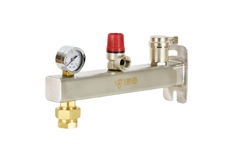 Grupa bezpieczeństwa IBO IGB 3, IGB 6 to urządzenie służące do montażu naczynia przeponowego oraz mające na celu kontrolę i zabezpieczenie przed nadmiernym wzrostem ciśnienia w instalacjach grzewczych. Grupa bezpieczeństwa jest wyposażona w manometr, odpowietrznik automatyczny, zawór bezpieczeństwa oraz zawór serwisowy.